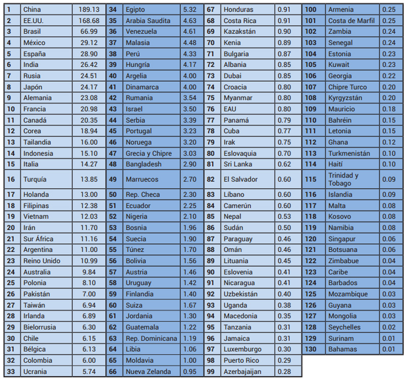 Entre los 130 países considerados, China fue una vez más el mayor productor de alimento balanceado, con 189 toneladas métricas manufacturadas en alrededor de 9,500 molinos. Los Estados Unidos y Brasil ocuparon el segundo y el tercer lugar respectivamente, con 169 millones de toneladas métricas provenientes de 5,236 molinos y 67 millones de toneladas métricas provenientes de 1,237 molinos, respectivamente.