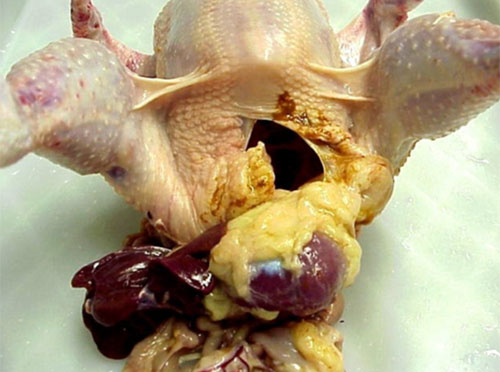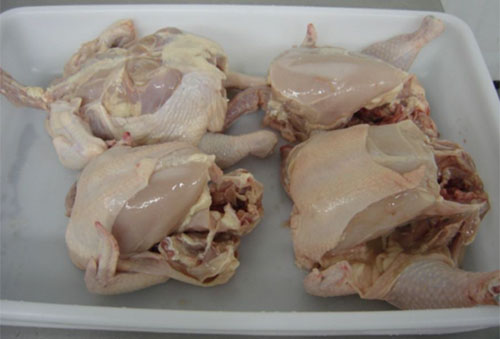 En las plantas de pollos esta inspección se hace en 2 puntos: después que se exponen las vísceras y al final de la evisceración, antes del chiller. La primera inspección es de carácter sanitario y físico (detectar enfermedades y defectos físicos) y la segunda para detectar contaminación (heces, bilis o alimento) antes que las carcasas pasen al enfriador (Figura 1).