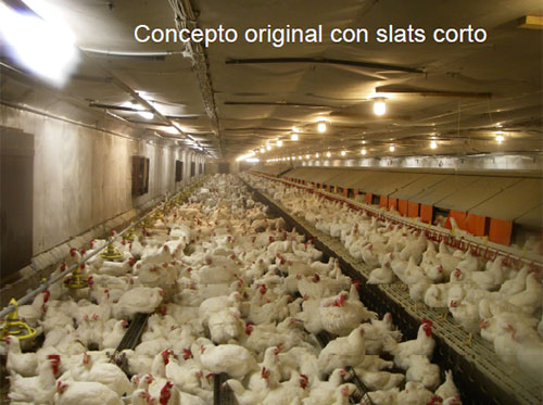 Los slats deben tener aperturas rectangulares cuando sean de plástico, aunque es mejor usar slats de madera. Es importante la altura de los slats y su inclinación debe estar entre 7 y 10 grados. Una línea de comederos se debe poner sobre los slats.