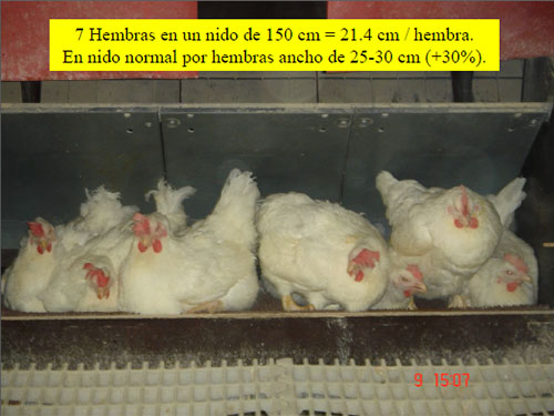 El limitante es el tipo de nido. Con nidales individuales, solo se puede trabajar con una densidad de 5.5 aves por m2. Con los nidos comunitarios, la densidad se puede incrementar hasta 8 aves por m2.
