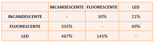 Por parte positiva, el consumo de energía es mucho más bajo, tiene mucho mejor durabilidad (25.000 hasta 40.000 horas), y menor producción de calor (85% de eficiencia) y se puede controlar la intensidad con dimers.