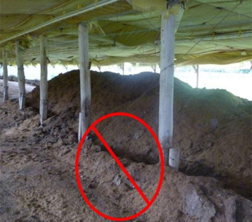 Tratamiento de champa o cascarón: Si la champa o cascarón se extrae fuera del galpón, es necesario también tratarlo. Se forman pilas en el exterior, alejadas de los galpones. Estas pilas se deben tapar con silo bolsa u otro plástico para que las lluvias no laven el material y no haya pérdida por lixiviación de los nutrientes. El hecho de tapar la pila, además de favorecer el proceso de autocalentamiento, evita que el material sea arrastrado por el viento y se pueda esparcir contaminando la producción de alguna granja cercana o la de su propio predio.