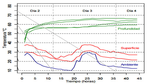 Los sensores ubicados en la superficie (líneas rojas), no superan los 40 ºC, esto no es suficiente para producir la muerte térmica de los microorganismos patógenos allí ubicados. En cambio, los sensores en el interior de la pila (líneas verdes) rondaron los 60ºC durante varios días, esta temperatura es adecuada para producir la muerte de los microorganismos patógenos.