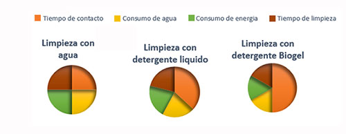 La gran ventaja que tiene el gel es el tiempo de contacto (ver fig. 4) y su capacidad de generar una espuma que permanece húmeda; y le permite realizar la detergencia (la remoción de un material no deseado de un substrato en cierto medio, generalmente con el uso de una fuerza mecánica y en presencia de una sustancia química que puede reducir la adherencia del material no deseado al sustrato) de forma más efectiva.
