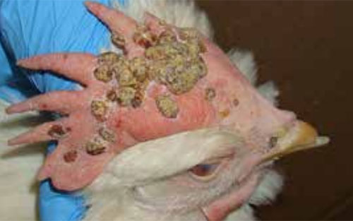 La viruela aviar se propaga lentamente y se caracteriza por el desarrollo de lesiones en la piel de las áreas sin plumas de la cabeza, cuello, piernas y patas (viruela seca).