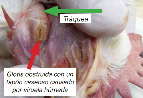 • Las lesiones pueden interferir con la habilidad del ave para comer, beber y respirar; la viruela húmeda en la tráquea puede resultar en alta mortalidad debido que la respiración es afectada