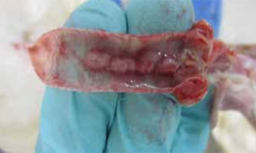 Tapón traqueal obstruyendo la glotis (entrada en la tráquea). Las aves con esta lesión mueren por asfixia. Foto: El Dr. Greg Celliers.