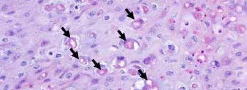 Cutáneos epitelioma infectado con el virus de viruela aviar. Las células infectadas están agradadas y contienen inclusiones de cuerpos citoplásmicos (flechas). Foto: Dr. Yuko Sato, Iowa State University.