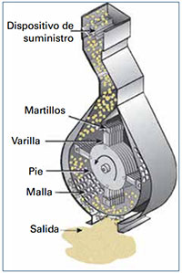 El tamaño de las partículas y la uniformidad producida por el molino de martillos depende del tamaño, forma, velocidad, y desgaste de los martillos, al igual que del tipo del diámetro de la malla utilizada.