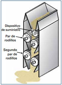 Los molinos de rodillos (Figura 5) utilizan rodillos cilíndricos, generalmente en pares para triturar (romper) el grano en partículas pequeñas.