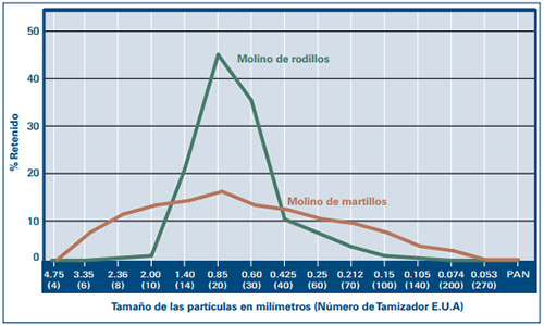 Generalmente, los molinos de rodillos muelen el grano en partículas de un tamaño más uniforme que los molinos de martillos (Figura 6).