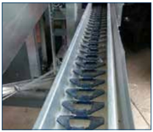 Los sistemas de alimentación de tipo cadena (Figura 7) - distribuyen el alimento arrastrando el alimento alrededor del sistema por medio de cadenas. Los sistemas de cadena pueden separar las partículas de alimento por tamaño al mover el alimento. Las cadenas pueden moler el alimento al pasar por el sistema, aunque los nuevos sistemas de cadena minimizan este efecto. El movimiento lento de las cadenas puede ser problemático ya que las aves que están al inicio de la línea de alimento pueden seleccionar comer las partículas grandes.