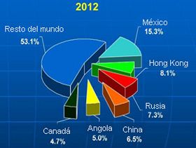 Los seis mercados más importantes para las exportaciones de carne de pollo estadounidenses en 2012 fueron: México con 560.544 toneladas valoradas en US$ 641,2 millones (subidas del 23 y el 42 por ciento respectivamente); Hong Kong, 296.085 toneladas valoradas en US$ 396,2 millones (bajadas del 46 y el 47 por ciento); Rusia, 266.995 toneladas valoradas en US$ 301,7 millones (subidas del 25 y 23 por ciento); China, 239.897 toneladas valoradas en US$ 283 millones (subidas del 149 y del 137); Angola , 182.027 toneladas valoradas en US$ 214,4 millones (subidas del 11 y del 18 por ciento) y Canadá, 173.037 toneladas valoradas en US$ 498,8 millones (subidas del 22 y del 32).