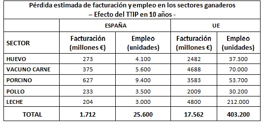 En las condiciones planteadas por la UE, la firma del TTIP supone una grave amenaza para el futuro de la ganadería comunitaria. Por ello, los sectores solicitan la actuación firme de los responsables nacionales y comunitarios para que en el acuerdo con Estados Unidos el sector ganadero europeo no sea sacrificado en aras de un libre comercio que no sería un “comercio entre iguales” por las enormes diferencias de modelo productivo entre ambas partes.