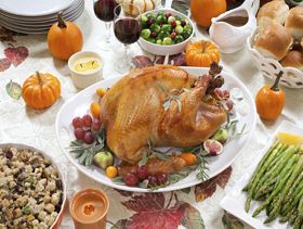 En la celebración del Día de Acción de Gracias no puede faltar el pavo en la cena. Fue uno de los principales alimentos escogidos por los peregrinos para compartir en la cena en agradecimiento a los nativos llamados Wampanoag y por la primera cosecha en su nuevo hogar. Se acompaña con salsa de arándano, pastel de calabaza, puré de papas, verduras y otros alimentos.