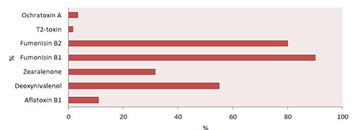 Los resultados de la encuesta muestran que un 55 % de las muestras de maíz estaban contaminadas con DON y un 11 % con AfB1. Solamente un 1,6 % de las muestras contenían toxina T-2. La mayoría de las muestras de maíz estaban contaminadas con FB1 (90 %) y FB2 (80 %).