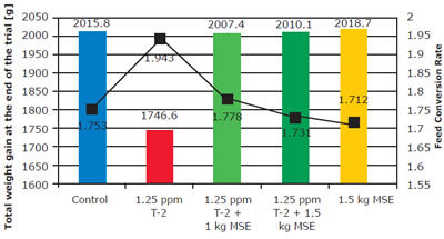 Table 2. Weight on day 39, feed consumption, weight gain and feed conversion rate of broilers fed with diets contaminated with T-2 toxin and treated with Mycofix® Select.