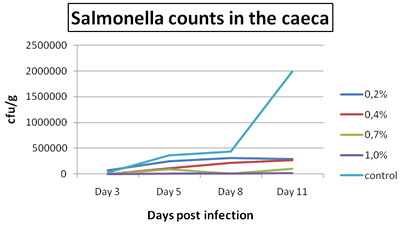 Efficacy of butyric acid glycerides in reducing intestinal colonization of Salmonella enteritidis This trial was carried out by Dr. Paola Massi at Public Animal Health Institute of Forlì, Italy, 2006 The trial design consisted of 5 treatment groups of 20 broiler chicks in each group. Each treatment group was offered a different quantity of butyric acid glycerides (0%, 0.2%, 0.4%, 0.7%, 1%) absorbed on silica. At 12 days of age (day 0) all birds were infected by endoesophageal way with 44*109 CFU of S.enteritidis. 24 hours after infection cloacal tampons were performed on all subjects to verify the establishment of S.enteritidis infection. On day 3, 5, 8, and 11, five birds of each group were sacrificed. The caeca were removed from each animal and tested to determine the count of S.enteritidis. Absence of S.enteritidis antibodies was determined with an ELISA test (IDEXXÒ). All birds were seronegative to S.enteritidis 24 hours after infection. All levels of butyric acid glycerides succeeded in reducing Salmonella in the caeca, compared to the control (0% butyric acid glycerides) group. Results of the bacterial counts determined in the caeca are reported in Figure 1. ![]() Figure 1: Salmonella counts in the caeca. Field trial with 3 600 000 birds Ross 508 chickens The aim of this study was to investigate the effectiveness of butyric acid glycerides in broiler chickens. Butyric acid glycerides were tested against a negative control under farm conditions. The trial was conducted in a private commercial farm in Italy. 3 600 000 Ross 508 chickens were divided into 2 groups. Both groups received the same commercial broiler diet. The experimental diets were fed for 42 days. The control group received no growth promoting feed additives. The trial group received butyric acid glycerides at inclusion level 0.2 % from day 1 to day 21 of age. The data recorded during the present trial are shown in Table 2. Table 2. Effect of butyric acid glycerides on growth performance in poultry