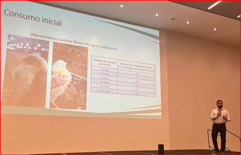 Henry Rivas, gerente de Servicios Técnicos de Aviagen para América Central, México y el Caribe (CAME), compartió ideas sobre “Manejo de pollos de engorde en la primera semana”. Él destacó que los primeros siete días son críticos para determinar el rendimiento de toda la vida de pollos de engorde, con el cuidado temprano influyendo directamente en los resultados tales como conversión alimenticia, uniformidad y rendimiento en carne. Rivas subrayó que el éxito durante esta etapa requiere estrecha coordinación a través de todas las partes de la cadena de producción – desde la calidad parental e incubación hasta el transporte y las condiciones en la granja.
