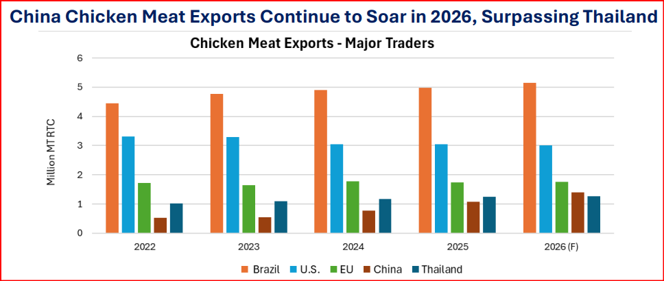 Las exportaciones de carne de pollo de China continúan disparándose en 2026, superando a las de Tailandia.