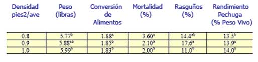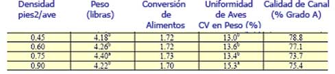 Las medias en una columna con diferentes superíndices son significativamente diferentes.(P<0.05) El estudio realizado por Feddes et al. (2002) demostró que cuando se reduce la densidad de aves, se reducen también los pesos de las aves vivas y de las canales (cuadro 2). Sin embargo, se logró una mejor uniformidad entre las aves al tener mayores densidades.