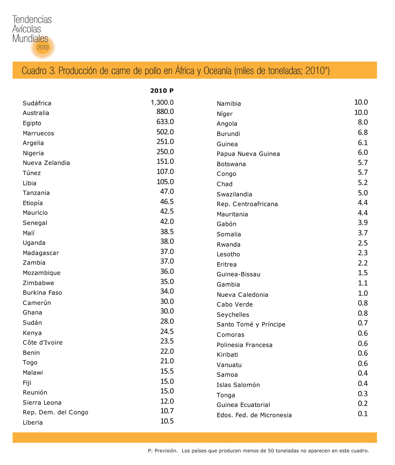 En Sudáfrica, el crecimiento de la producción de pollos de engorda se desaceleró a sólo uno por ciento en 2009, en comparación con un crecimiento promedio anual superior a cinco por ciento en los últimos seis años. En los primeros siete meses de 2010, se previó un aumento en la producción de poco menos de tres por ciento. Cabe señalar que los datos presentados por la Asociación Avícola Sudafricana (SAPA, por sus siglas en inglés) son considerablemente mayores que los publicados por FAOSTAT. Por ejemplo, el cálculo de la SAPA para 2008 es de 1.24 millones de toneladas.