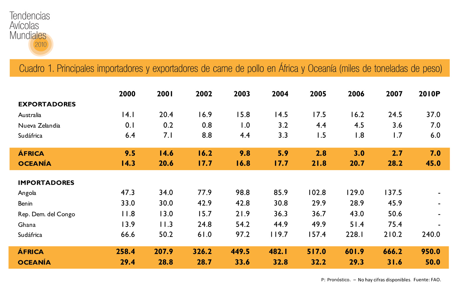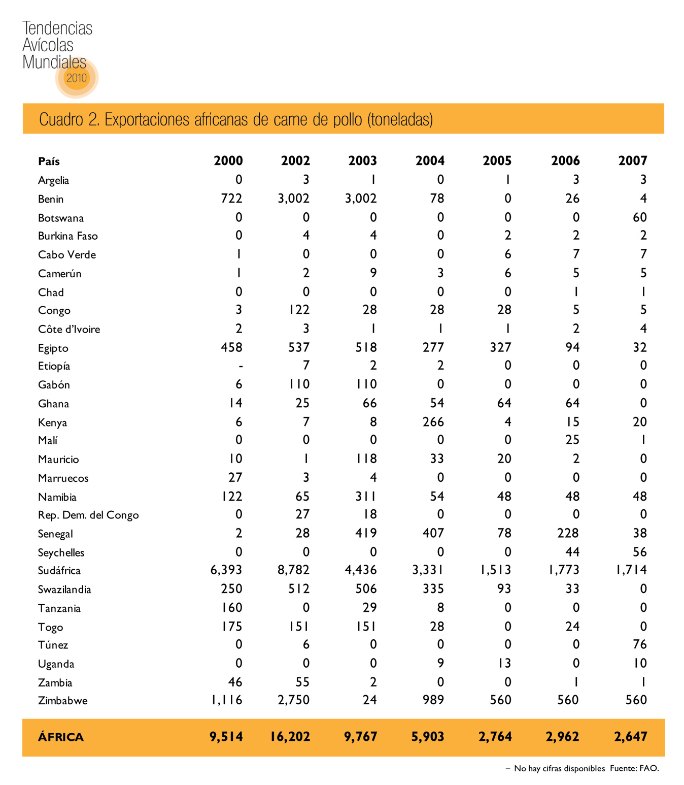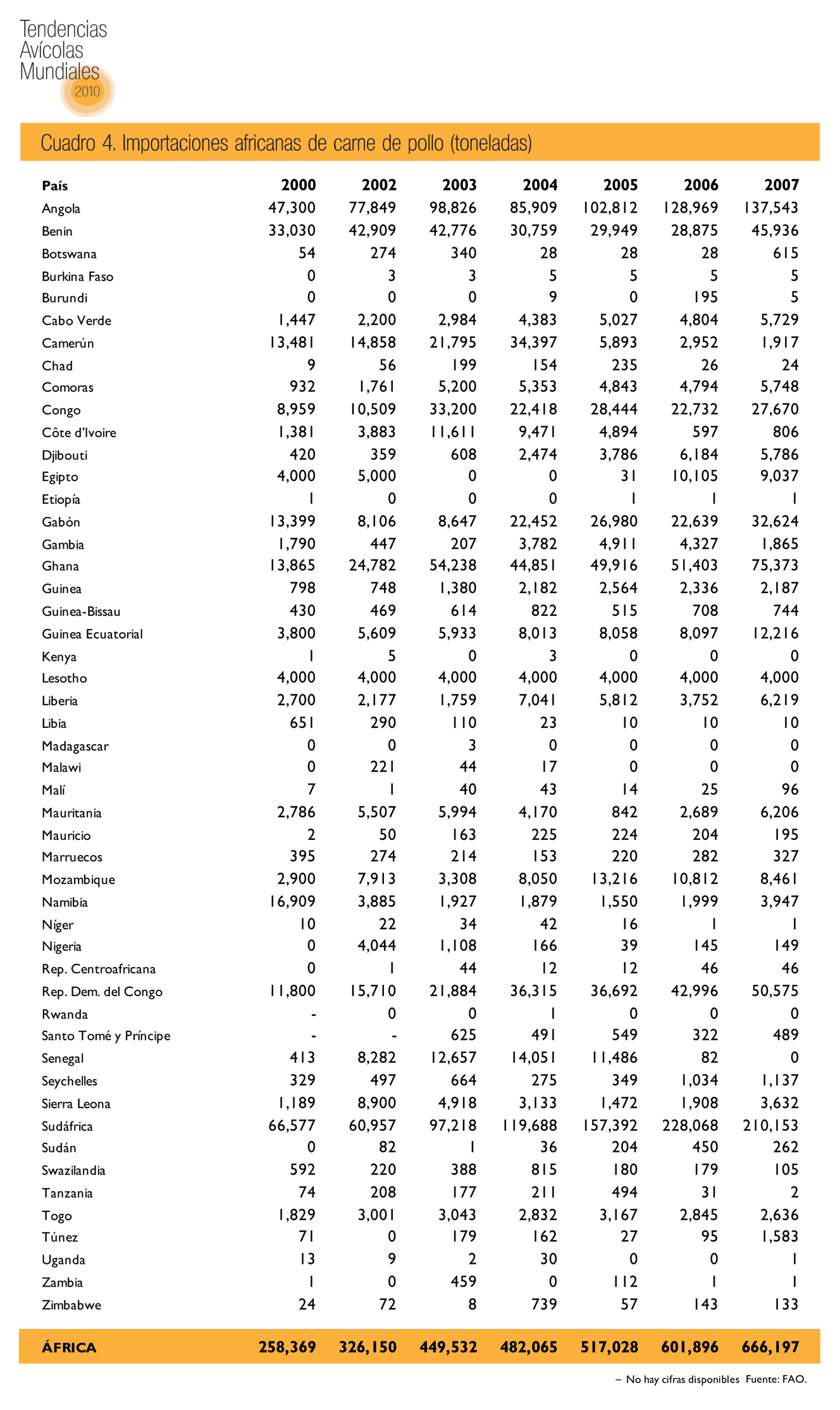 En cambio, entre 2000 y 2007, las importaciones de carne de pollo a África se duplicaron con creces al pasar de 260,000 toneladas a 666,000 toneladas; Sudáfrica, Angola y, en menor medida, Ghana fueron los principales importadores (cuadros 1 y 2).