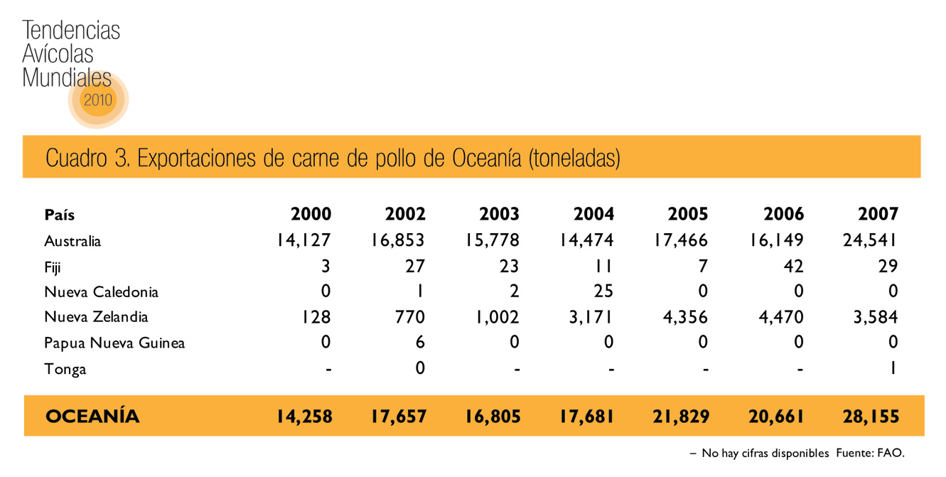 De acuerdo con las previsiones para 2010, las exportaciones de carne de pollo de Oceanía serán del orden de 45,000 toneladas, de las cuales al menos 37,000 corresponderán a Australia, y podrían importarse cuando menos 50,000 toneladas.