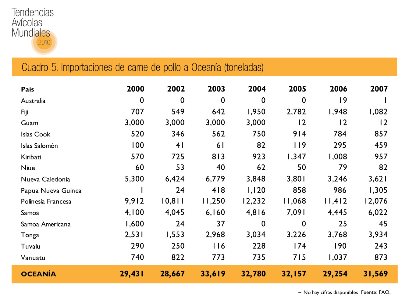 Como resulta evidente, Oceanía no es uno de los principales participantes en el comercio de carne de pollo. Entre 2003 y 2007, las importaciones anuales ascendieron a poco más de 30,000 toneladas, en su mayoría adquiridas por la Polinesia Francesa (cuadro 5).