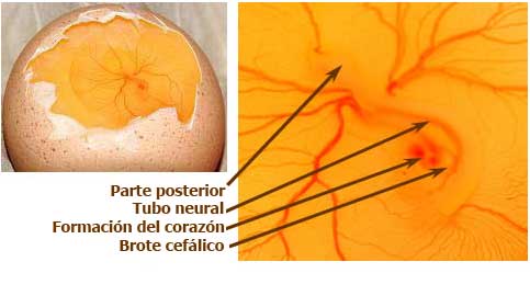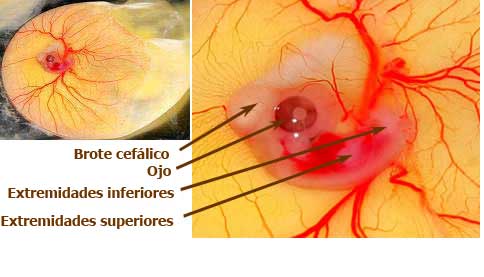 Día 3: El embrión está echado sobre su lado izquierdo. Inicia la circulación de la sangre. La membrana vitelina se extiende sobre la superficie de la yema. Se pueden discernir la cabeza y el tronco, así como el cerebro. Aparecen las estructuras cardiacas que comienzan a latir.