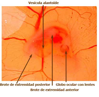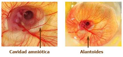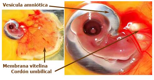 Día 4: Desarrollo de la cavidad amniótica, que rodeará el embrión: llena con líquido amniótico, protege el embrión y permite que se mueva. Aparece la vesícula alantoidea: juega un papel importante en la resorción de calcio, la respiración y el almacenamiento de residuos.