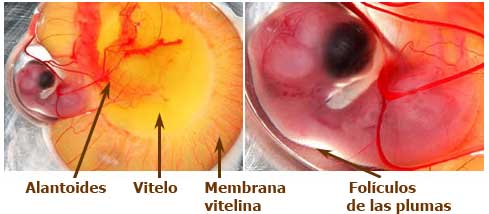 Día 9: Aparecen las garras. Brote de los primeros folículos de las plumas. Crecimiento de la alantoides y aumento de la vascularización del vitelo.