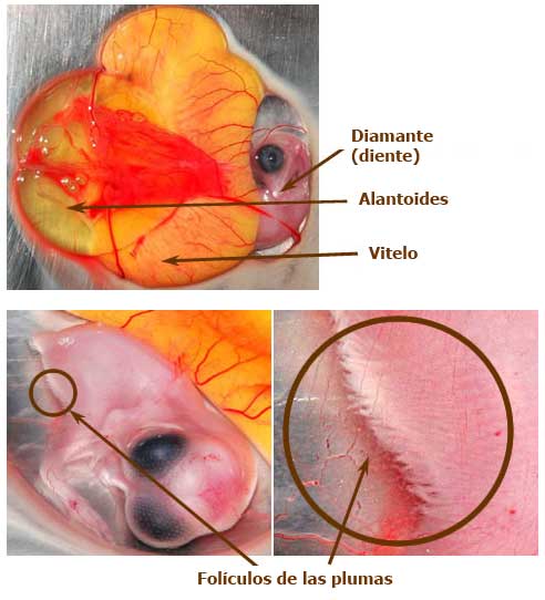 Día 13: La alantoides se encoge para convertirse en la membrana corioalantoidea. Aparecen las escamas de las garras y de las piernas.