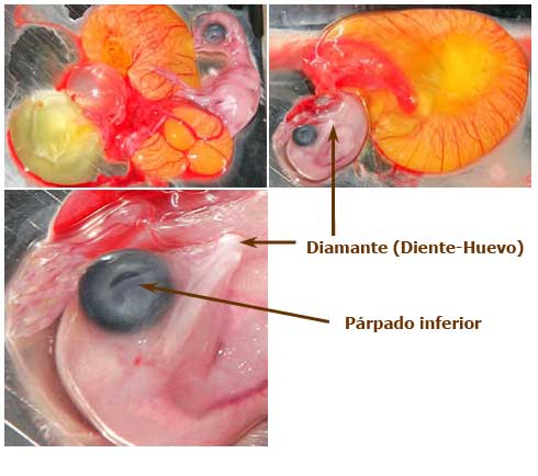 Día 19: Se acelera la resorción del vitelo. El pico está contra la membrana de la cáscara interior, listo para perforarla.