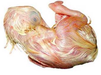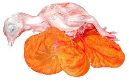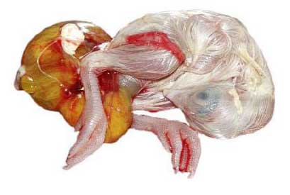 Día 17: El sistema renal del embrión produce uratos. El pico, que está bajo el ala derecha apunta hacia la celda de aire. La clara de huevo se reabsorbe totalmente.