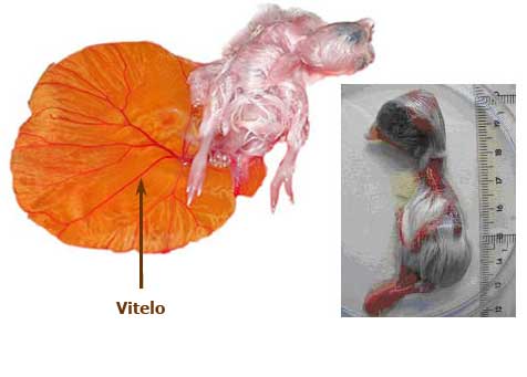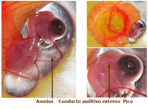 Día 8: La membrana vitelina cubre casi toda la yema. La pigmentación de los ojos es fácilmente visible. Se pueden diferenciar la parte superior e inferior del pico, así como las alas y las piernas. El cuello se estira y el cerebro está completamente ubicado en su cavidad. Apertura del conducto auditivo externo.