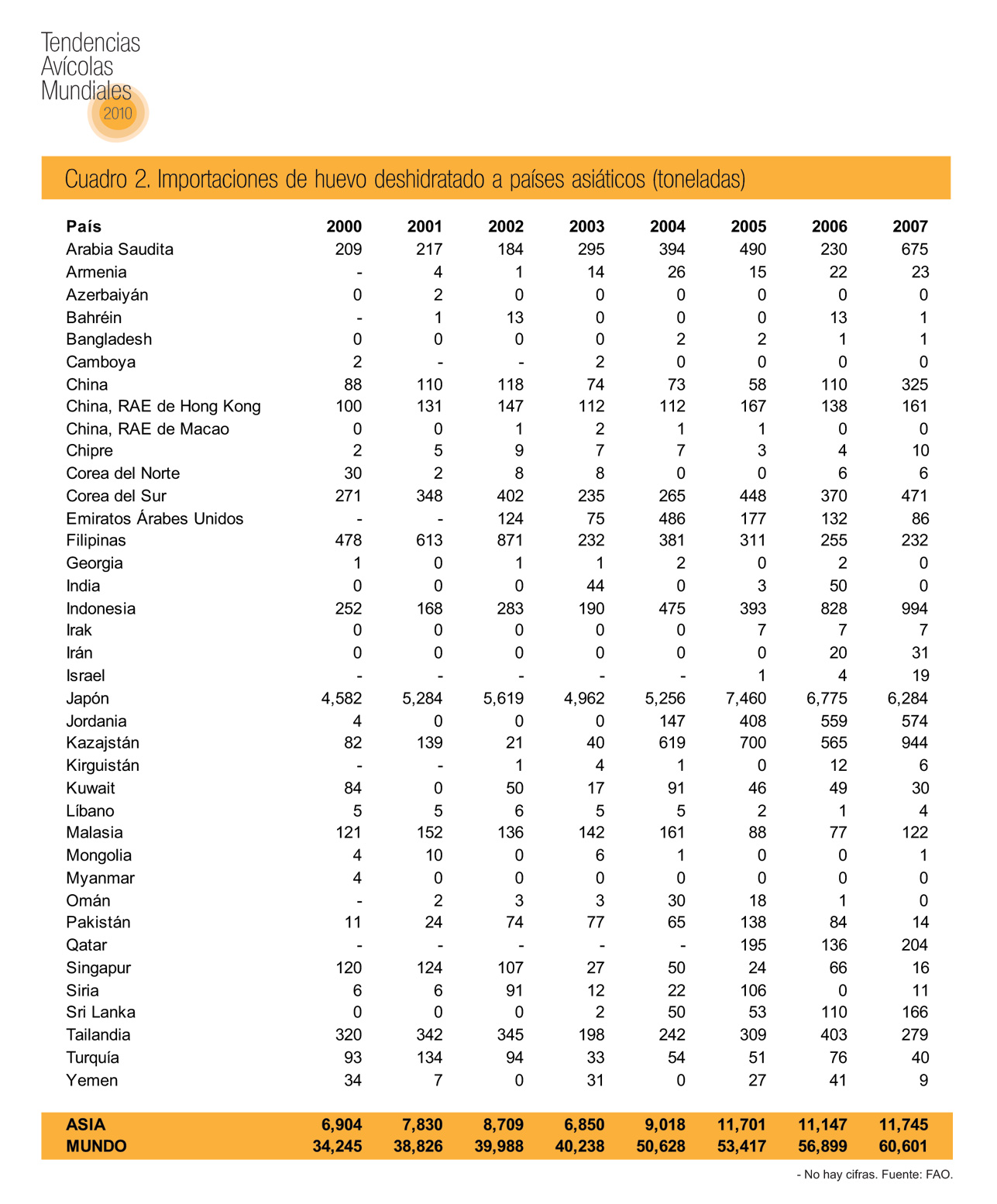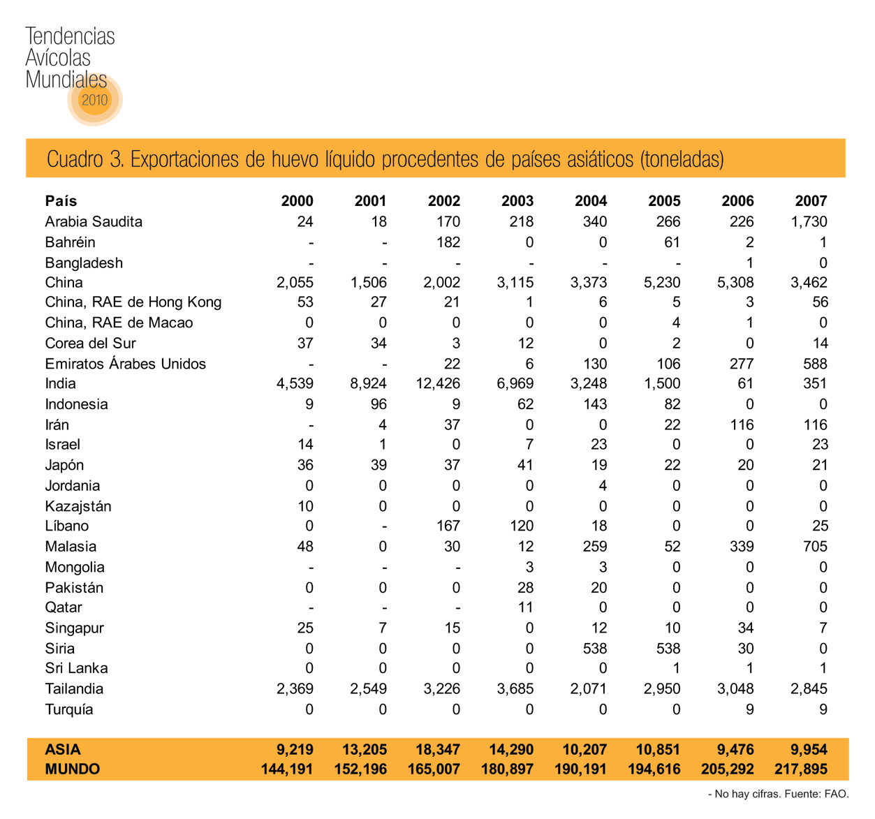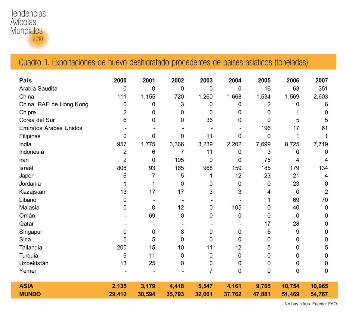 Aunque el volumen de huevo deshidratado que se comercia en el mundo aumentó casi 80 por ciento entre 2000 y 2007, al pasar de 34,245 toneladas a 60,600 toneladas, las cantidades exportadas de países asiáticos se quintuplicó: de poco más de 2,100 toneladas a casi 11,000 toneladas. Este notable crecimiento obedece sobre todo a la expansión de las ventas de productos de huevo deshidratado indios.