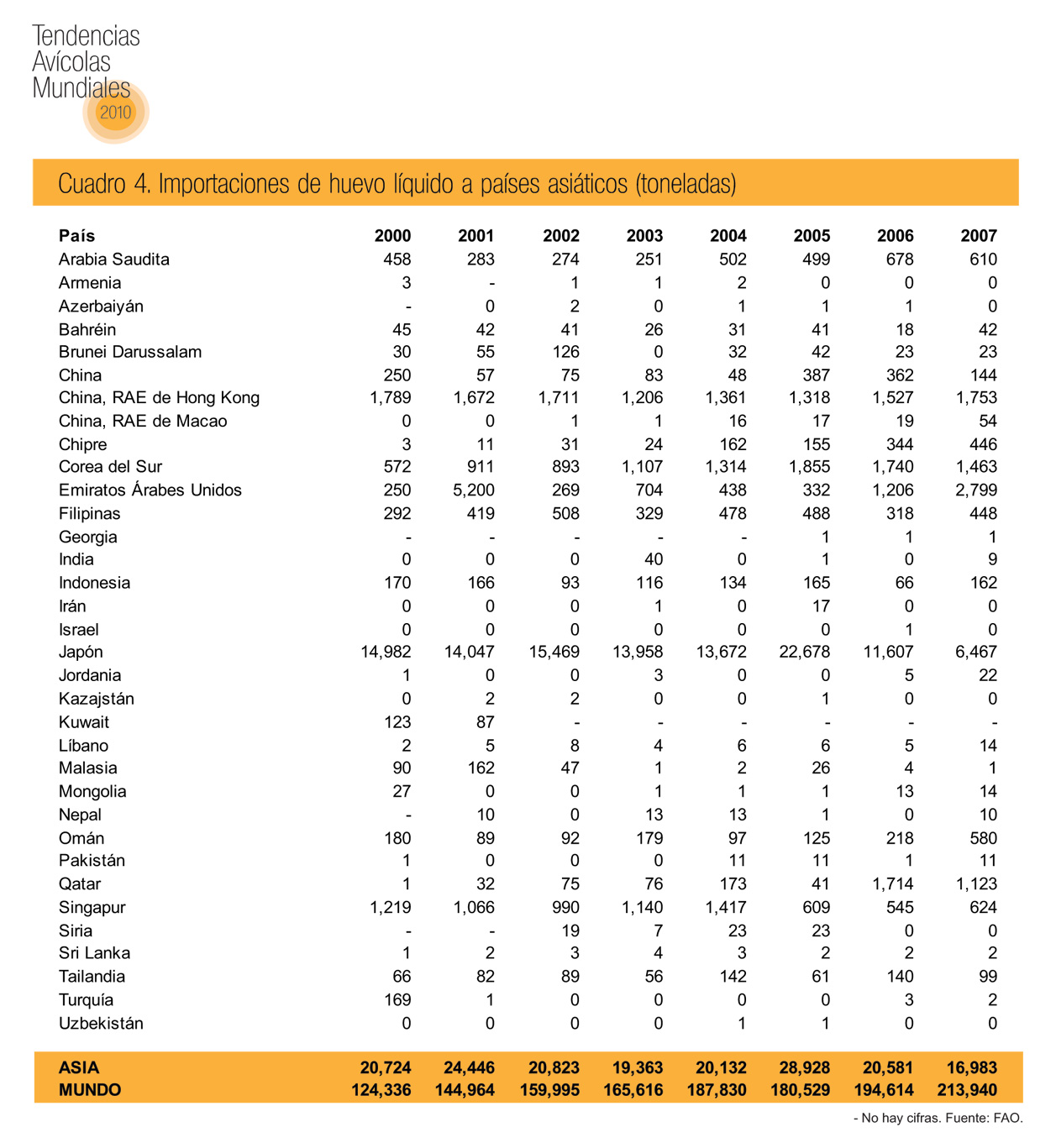 Aunque ha aumentado la cantidad de huevo líquido en el comercio, el crecimiento registrado desde 2003 ni de lejos ha sido tan notable como el del huevo deshidratado, considerando que el total mundial en 2007 ascendió a casi 220,000 toneladas (cuadros 3 y 4). Sin embargo, las cantidades comerciadas por países asiáticos en realidad disminuyeron con exportaciones inferiores a 10,000 toneladas en 2006 y 2007, como consecuencia de una caída en los embarques, particularmente de la India a Emiratos Árabes Unidos, Omán y Kuwait, todos ellos países de Medio Oriente.