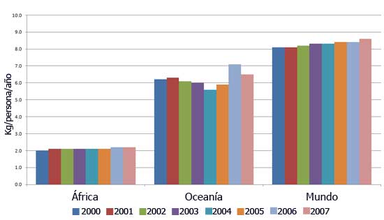 Si estos cálculos para Australia y Nueva Zelanda estuvieran cercanos a las cifras reales, entonces el promedio actual de Oceanía estaría ahora cercano a los 10 kg por persona, y por encima del probable promedio mundial de alrededor de 9.3kg.