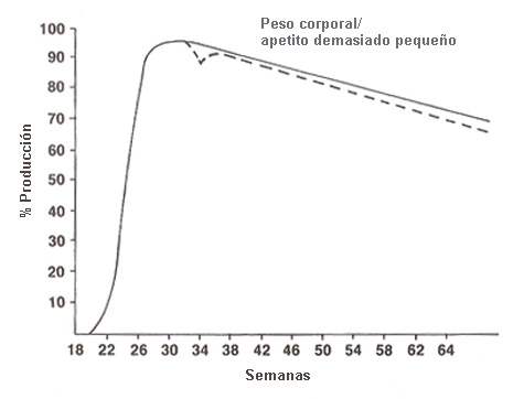Las gallinas toman de las pocas reservas que tienen si su peso estaba por debajo de la tabla y continúan subiendo la producción, pero esto está limitado al momento en que las aves no usan mas reservas corporales, comenzando a descender la producción de huevos. Si en el punto en que la producción disminuye pesamos las gallinas su peso corporal habrá descendido y si las pesamos nuevamente cuando la producción se recupera tendremos un peso corporal mayor, la gallina ha aprovechado estos días de descanso para acumular nuevas reservas.