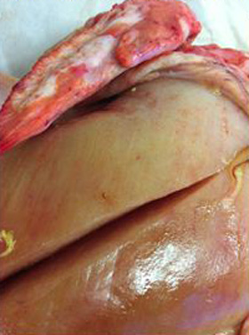 Además, se observan tejidos subcutáneos naranjas y rosas, vetas pálidas en el hígado y áreas moteadas pálidas en los polos del riñón así como una infiltración de grasa.