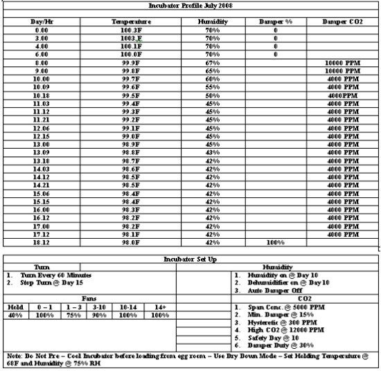 Analizando el perfil de incubación presentado arriba, vemos que la temperatura se mantiene día a día durante todo el desarrollo embrionario dentro de la zona óptima del potencial de nacimiento. La humedad relativa va en descenso y de acuerdo a la apertura del dámper, para tener una óptima pérdida de humedad utilizando lo menos posible la humedad mecánica y, mayormente, la humedad propia del huevo y los niveles de CO2, llegando hasta las 10,000 partes por millón durante los primeros 10 días y aprovechar sus beneficios previamente comentados.