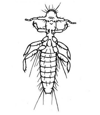 Este piojo (arriba) es plano, amarillo, de movimiento rápido, de alrededor de unos 2mm de largo, generalmente se ve alrededor de la cloaca o bajo las alas, pero se esconden de la luz cuando se separan las plumas