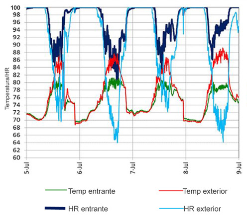 Figura 3. Cojinetes de enfriamiento por evaporación programados para operar a 80°F (26°C) durante el clima húmedo y caliente