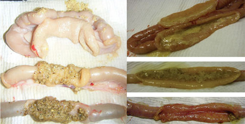 Las imágenes de la derecha muestran intestinos con mala salud de diferentes aves. Aquí, la superficie del intestino luce inflamada, el tono intestinal es pobre y los contenidos consisten en moco y fluido excesivo. Todo estos factores son indicadores de una mala salud intestinal y