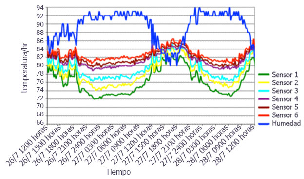 Figura 4. Corrida de ventiladores en la noche. Esta gráfica muestra el aumento de temperatura que puede ocurrir si la mitad de los ventiladores son apagados. El galpón en esta gráfica estuvo en modo túnel solo