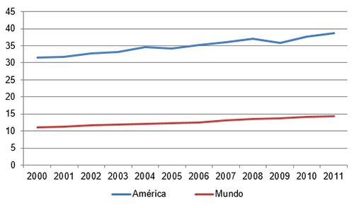En el año 2000 América representó algo de 13.7 por ciento de la población (Cuadro 1) pero esta proporción disminuye sólo un poco para el año 2030, cuando el total de la región se calcula ascenderá a 1.1 mil millones, de una cifra global de unos 8.4 mil millones.