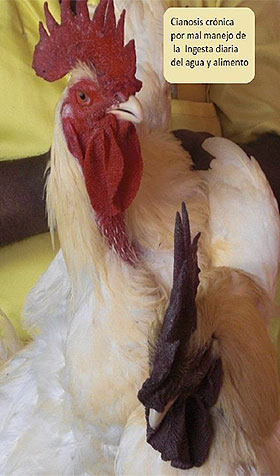 Cianosis se refiere a la coloración azulada oscura de la cara, crestas y barbillones. Se presenta en forma aguda pero también en forma crónica y transitoria. Mientras que su etiología es desconocida está relacionada a los sistema de alimentación y sistemas de agua de bebida.