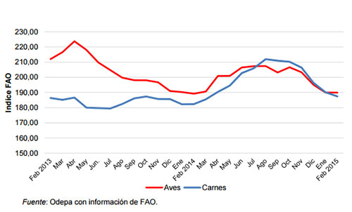 A comienzos de 2015 se aprecia cómo el índice de carnes vuelve a situarse por debajo del de aves, principalmente por las menores cotizaciones de las exportaciones de carne bovina de Australia, mientras que la carne de ave se mantuvo invariable respecto al mes anterior, volviendo a los niveles registrados a comienzos de 2014.