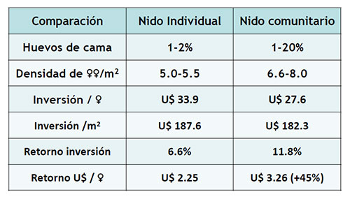 Los nidos comunitarios requieren un manejo más cuidadoso pero su uso permite mayores densidades, lo que da mejores resultados económicos para la parvada.
